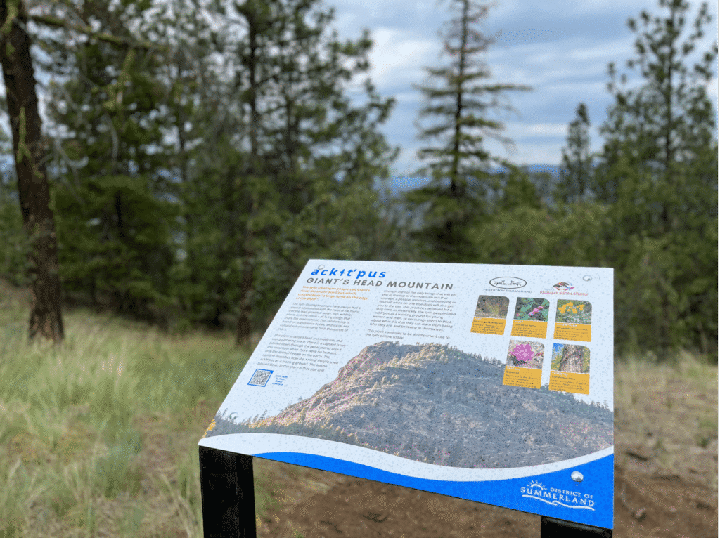 The Okanagan Nation Alliance has been in partnership with the municipality of Summerland in unveiling Syilx signage on ackɬt’pus (Giants Head Mountain) trails. On June 9th, Chief Greg Gabriel of the Penticton Indian Band, alongside Richard Armstrong and the ONA, joined the Mayor of Summerland and council members in honouring all collaborative efforts in completing the ackɬt’pus interpretive signage.